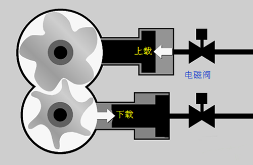 柱塞式調節被廣泛應用于螺桿式冷水機組調節。下圖為某品牌冷水機組柱塞式調節示意圖。